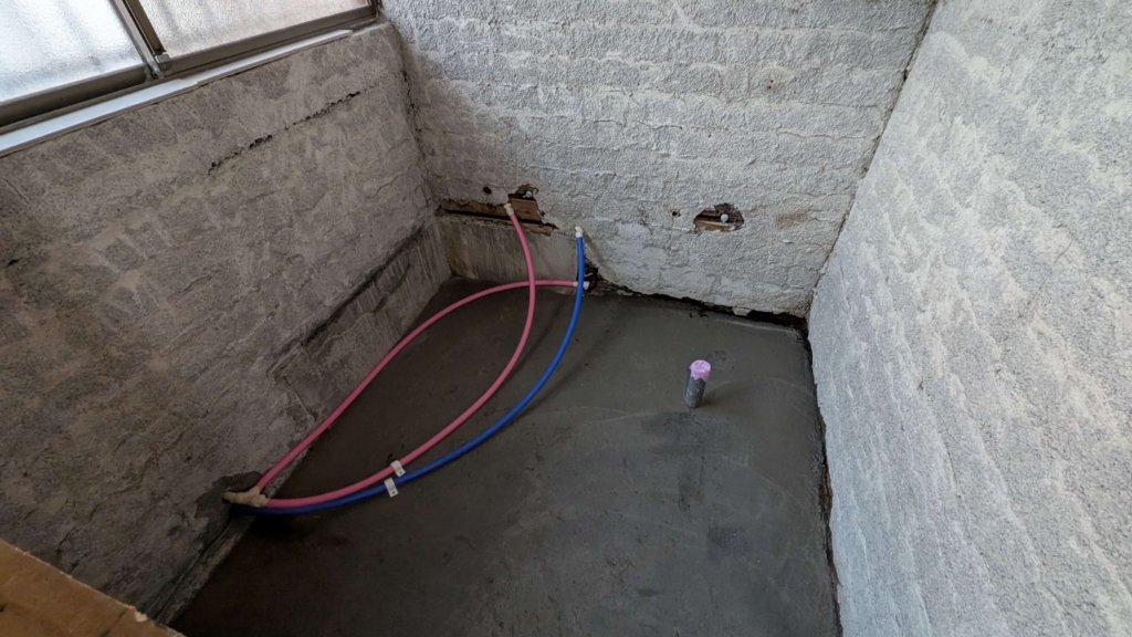 タイル風呂を撤去解体・コンクリ打ち込みで床レベル調整と養生…3日