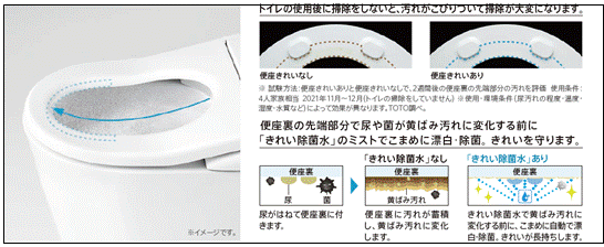 そしてトイレ使用後と8時間使用しない時に「きれい除菌水」のミストを便器ボウル面に自動で吹きかけます。