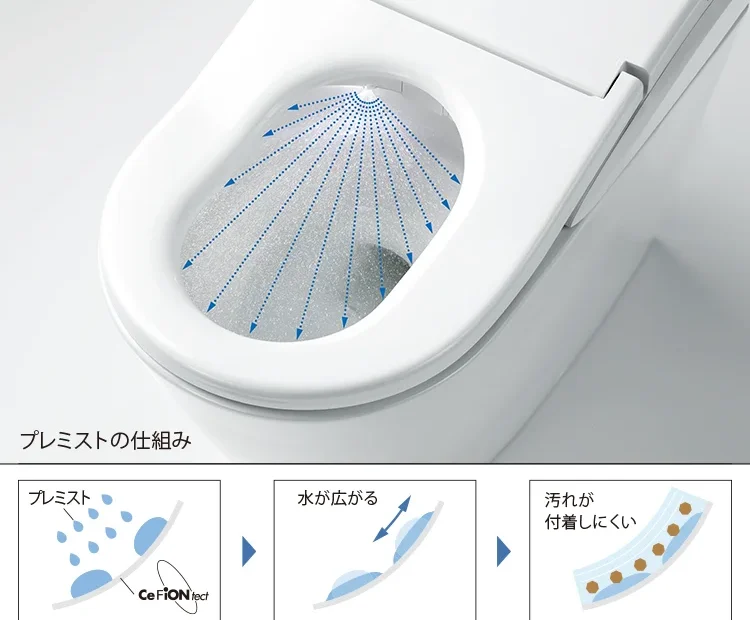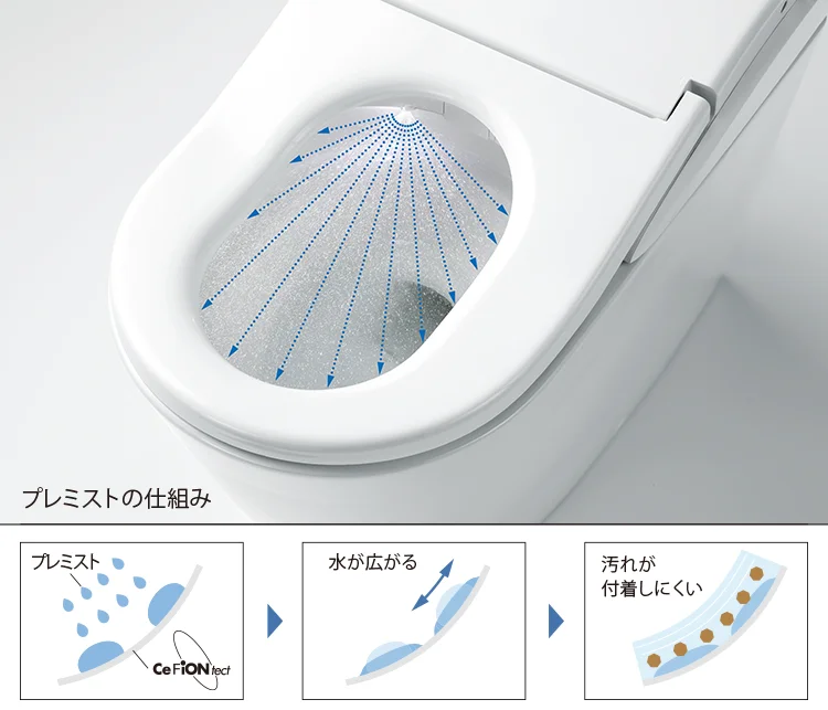 ご使用前に便器ボウル面に汚れを付きにくくするミスト(水)を噴霧します これがプレミスト機能